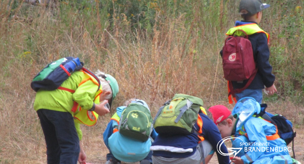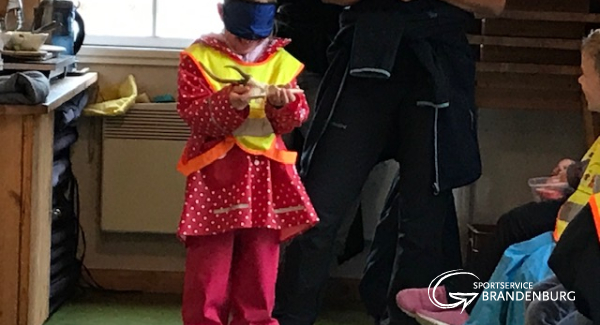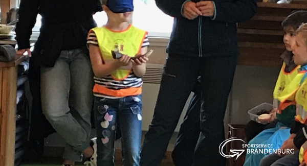 Ganz zum Schluss kommt der Tastsinn zum Einsatz. Mit verbundenen Augen ertasten die Kinder ein Ziegenhorn, einen Fuchsschädel, ein Wespenenst, einen Kieferknochen vom Wildschwein.