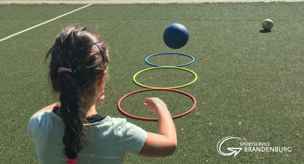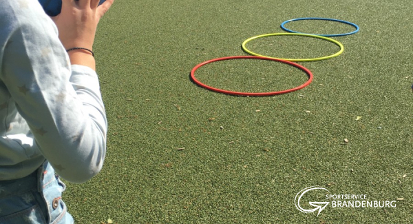 --> Übung 2: „Ballzielwurf“ - Mit einem Seil wird die Abwurflinie festgelegt. Die drei Reifen (70 cm Durchmesser) werden in einem Abstand von 1,5 Meter zu dem Seil, hintereinander, in einer Linie, gelegt. Ziel ist es, in den mittleren Reifen zu treffen.