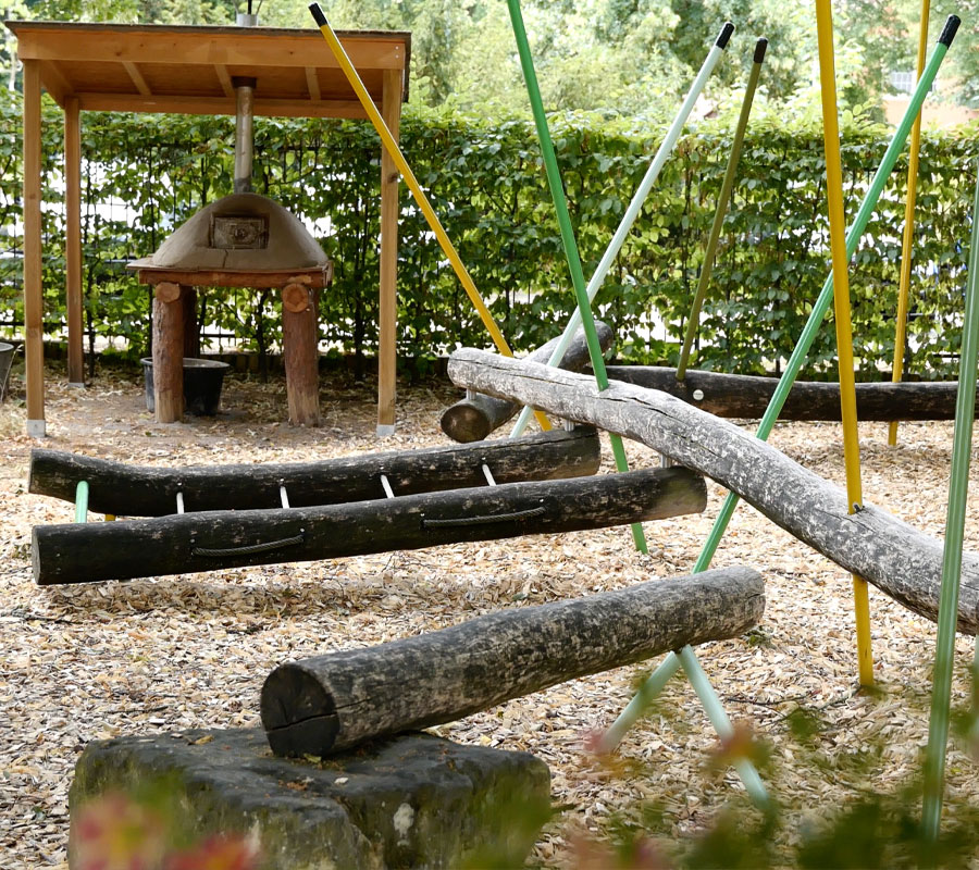 Natürlich gestaltetes Außengelände mit Kletterbereich, Balancierstrecken & Sandflächen