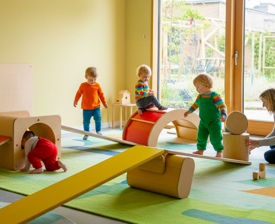 Bewegung ist für uns Ausdruck von Leben, Lernen und Persönlichkeit. Unsere Kita-Räume sind so gestaltet, dass sie Bewegung nicht begrenzen, sondern herausfordern. Unsere Haltung: Jedes Kind darf sich auf seine Weise entfalten – mit Freude an Bewegung und Vertrauen in sich selbst.